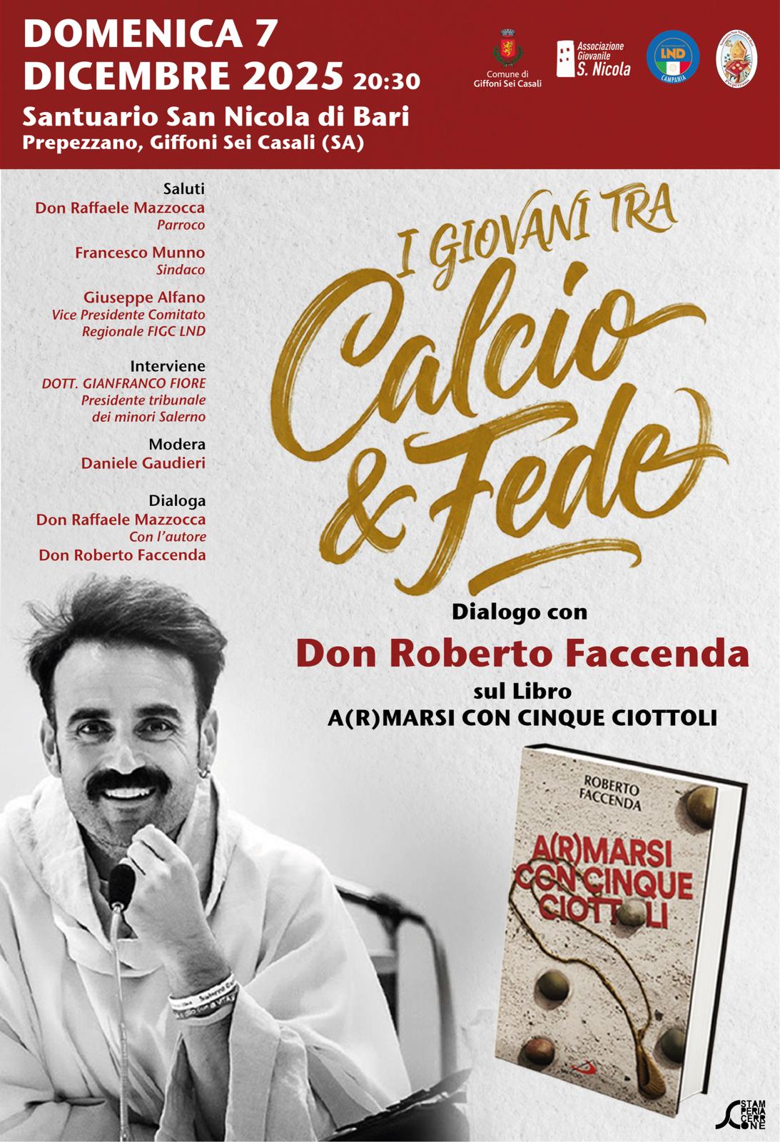 Domenica 7 dicembre nello splendido Santuario San Nicola di Bari al casale Prepezzano, a partire dalle ore 20.30, incontro/dialogo con don Roberto Faccenda, Responsabile della Pastorale Giovanile della Diocesi di Salerno sul libro "A(R)marsi con cinque ciottoli".